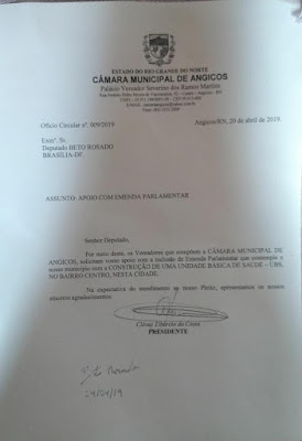 Junto a Beto, ele solicitou por meio de ofício entregue pessoalmente ao deputado emenda parlamentar para construção de uma Unidade Básica de Saúde (UBS), para o bairro Alto da Esperança, que é o bairro mais populoso de Angicos.